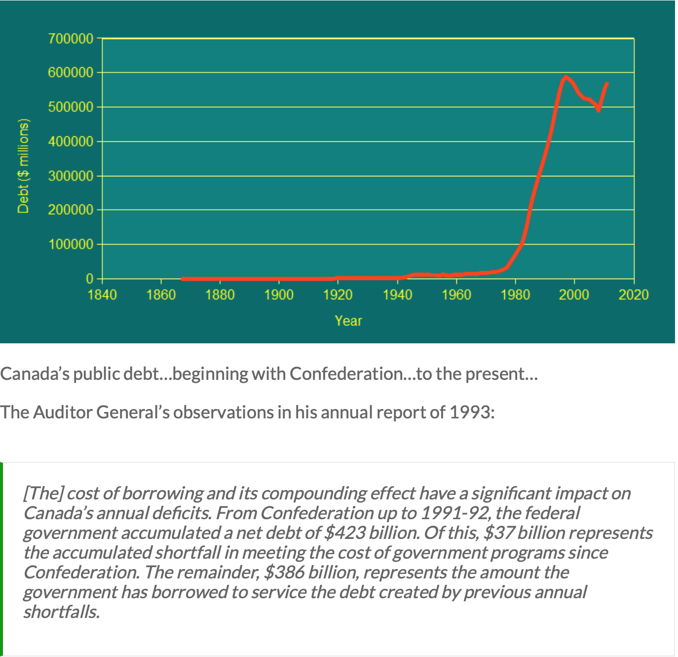It results in ninety percent of our federal budget devoted to paying interest when simply continuing the Bank of Canada’s policy of financing government deficits - as was the case from the 1934 opening of the Bank of Canada - would lead to a ninety percent reduction of our federal budget.